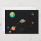 A colourful invitation featuring a spaceship with a photo window, planets and stars in a black background. A delightful invitation for your space-theme party.