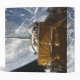 Space Shuttle Atlantis' payload bay backdropped by a blue and white Earth featured with STS-125.