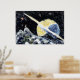 A Saturn-like planet, dark sky, rugged surface of its satellite and a lonely figure on a rock.