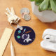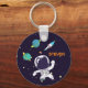 A personalized keychain with a dark blue background with yellow stars scattered around. Layered over top is an illustration of a spaceman wearing a white astronaut suit floating in space. Off in the distance are planets with rings and a rocket ship blasting off to places unknown.