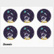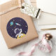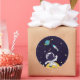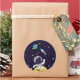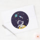 A sticker with a dark blue background with yellow stars scattered around. Layered over top is an illustration of a spaceman wearing a white astronaut suit floating above the moon. Off in the distance is a planet with rings and a rocket ship flying off into the sky looking for new worlds to explore.