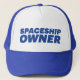 SPACESHIP PROPRIÉTAIRE slogan amusant sur chapeau de camionneur, bleu, typographie audacieuse, déclaration amusante, inspiré par le personnage de télévision frank rossitano.