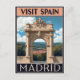 A majestic vintage-style travel poster inviting you to Visit Spain and the grand city of Madrid. This stunning illustration features an ornate, classical stone archway and statue, which frames a picturesque view of the red-tiled rooftops of the city below and the rolling Spanish hills. The artwork perfectly captures the grand architecture and scenic beauty of the region. Ideal for travel enthusiasts, collectors of retro illustration, and lovers of Spanish culture and history.