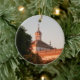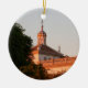 This ornament features a photograph of a stunning baroque building in Seville, Spain. The building’s whitewashed walls contrast beautifully with the intricately detailed lattice work, a warm brown tiled roof topped by a yellow and white rounded dome. The pale blue sky and deep green trees complete this pretty image.