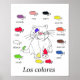 Spanish colour teaching poster showing a cute cartoon cat covered in paints.