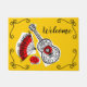 Whimsical design drawn in a retro style featuring souvenirs from a Spanish holiday; a wrought iron guitar, lacy fan and red rose. A customizable design in black, white, red and golden yellow for you to personalise with your own text, images and ideas. An original digital art image.
