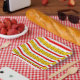 Mid-century inspired decorative retro design with a Spanish flavour featuring a stripe in gold, red and white and black swirl embellishment. Created to co-ordinate with the Spanish Souvenirs range of home accessories and party supplies.