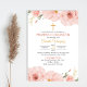 Invita a tus seres queridos a compartir esta ocasión sagrada con esta elegante invitación que presenta delicadas flores de colour durazno y un encantador diseño de cruz. Perfecta para celebrar una primera comunión rodeada de familiares y amigos. Disponible en español.