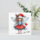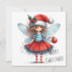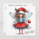 Celebrate the season with a festive and imaginative design featuring a playful Christmas fairy holding a red ornament. Dressed in a glittering red skirt, striped stockings, and a Santa hat adorned with holly, she brings joyful charm to your holiday message. Her delicate blue wings and curious expression add a touch of magic to the clean white background, where “MERRY CHRISTMAS” appears in a cheerful handwritten font. On the reverse side, a heartfelt greeting is included with the sender’s name, offering a warm and personal message perfect for sharing seasonal sparkle and delight. Ideal for those who love quirky elegance and fairy-inspired holiday cheer.