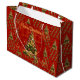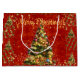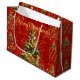 Joyful and elegant Merry Christmas gift bag with beautiful green Christmas tree decorated with colourful ornaments and sparkling lights over red background.