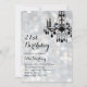A fancy chandelier on a backdrop of silvery lights accents this birthday invitation.