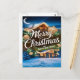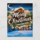 A festive postcard featuring elegant typography with the words Merry Christmas and Happy New Year surrounded by shimmering snowflakes, holly, and twinkling lights.