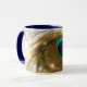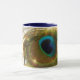 Glamourous holiday mug with beautiful peacock feather, silver tinsel and sparkling Christmas lights