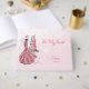 Handdrawn fashionillustration of a woman in a pink dress with a big cake both covered with magnolias. Background is pink and sparkling. The words "Happy Birthday" and your name can be customized easily by clicking the abc button.
