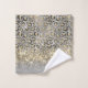 On this stylish towel set is a silver metallic sheen on the bottom of the large towel where you can personalize it then a glittery gold pattern that blends into a glittery leopard print with a silver backdrop for extra pop. Can be personalized on the bottom large towel. Glam chic vibes.