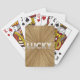 These cards feature a gold glitter graphic design with the word LUCKY in large letters with a metallic sheen, centered on gold glitter. The background has a dramatic sunburst effect with radiating lines emanating from the center, creating a starburst pattern. The texture of the background is glittery and sparkly with a luxurious, festive appearance. The cards are poker cards. There are 52 cards and 2 joker cards in each deck.