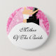 Trendy Pink Sparkly bride wedding party buttons for your bridal party. Our bridal party buttons feature a bride & groom set on a sparkly mosaic tile print background. Just customize with your information and you're all set to go. Available in our shop @ www.celebrateitwedding.com in additional colours! Matching bridal shower invites, thank you notes and stickers are also available.