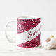 Glam and glitter coffee mugs with a pink sparkle background. Personalize with your name to make the designer coffee mugs special and unique.