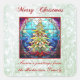Bright and vibrant stained glass design of a multicolored Christmas tree in a red frame. With pale green glitter background and "Merry Christmas". You can change the customizable personal greeting at the bottom of the design to your own message.