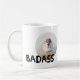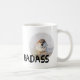 Photo of a small but rather aggressively looking at you sparrow and a text Badass. This is really a troublemaker. Funny coffee mug.