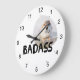 Photo of a small but rather aggressively looking at you sparrow and a text Badass. This is really a troublemaker. Funny wall clock.