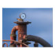 Sparrow sitting behind metre and on top of a red and rusty old machine used for checking air pressure on early evening.