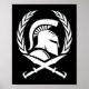Silhouette of spartan helmet and shoulders with two crossed swords and wreath surrounding helmet.