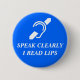 International Symbol for the Deaf over the words SPEAK CLEARLY I READ LIPS. White on blue background!