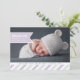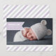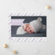 Add your favorite landscape oriented newborn photo to this modern full-bleed announcement and share your joy with friends and family. Design features your baby girl's name, birthdate and birth stats on a pale lavender ribbon banner, with your family greeting displayed atop a bottom border of diagonal stripes in white, pale gray and lavender.