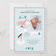 A photo birth announcement resembling an air mail envelope features a stork, baby footprints, a post mark and in place of a postage stamp is a window for your baby's photo. The card is easy to customize with your wording, font, font colour and choice of six paper types.