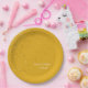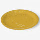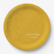 Shown is this golden petite stars printed paper plate in a custom Mellow Yellow colour. Stars are not actual gold metallic or gold foiled, simply a gold-like colour. Stars angled on 3/4 of the plate. Personalized names to customize to your own name or phrase. Create your own colour using the custom colour option.