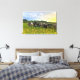 This canvas wall art features a row of black and white Speckle Park cattle standing behind a barbed wire fence with bright yellow weeds in the foreground and a partly turbulent grey sky mixed with the setting sun behind. It would be a perfect pop of colour wherever you display it.