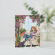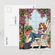 Keep in touch with this cute postcard. A fun comic book illustration of a woman sitting on her lawn chair on her patio, with her cat, a cup of coffee or tea and surrounded by purple clematis and hanging plants.