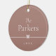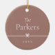 Sweet and simple Christmas ornament features a minimalist layout, with your family name and the year in clean, classic serif typeface on a soft earth tone terracotta background. A petite bow through the centre completes the design. Add a photo to the reverse side.