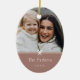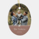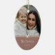 Sweet and simple oval-shaped Christmas photo ornament features a minimalist layout, with your family name and the year in clean, classic serif typeface on a soft earth tone terracotta background. A petite bow beneath your photo completes the design.