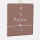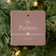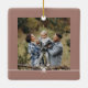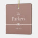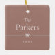 Sweet and simple Christmas ornament features a minimalist layout, with your family name and the year in clean, classic serif typeface on a soft earth tone terracotta background. A petite bow through the centre completes the design. Add a photo to the reverse side, accented with a matching bow illustration.