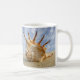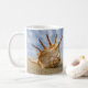Closeup photograph of a spider conch shell on a sandy beach against blue sky with wispy clouds. Customizable mug size, style and colour.