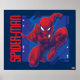 Spider-Man leaps out of this blue, high-tech cutout badge with his name in red along the left side.