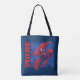 Spider-Man leaps out of this blue, high-tech cutout badge with his name in red along the left side.