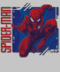 Spider-Man saute de ce badge bleu et high-tech découpé avec son nom en rouge sur le côté gauche.