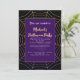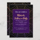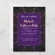 Personalize Hallow's eve invite with purple orange spider web Halloween pattern on black. With white text and purple bats.