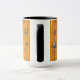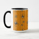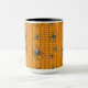 A bright orange background creates a perfectly Halloween-themed base for a repeating pattern of black web crawling with spiders. These spiders, modelled after the false widow, feature a bright white skull on their abdomens and other white markings on their body and legs. This mug is available in a variety of colours, sizes, and styles including travel mugs and steins.