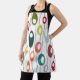 This apron has a mid-century modern design of horizontal coloured lines on a vertical black line with circles.