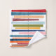 This towel set has a mid-century modern design of horizontal coloured lines on a vertical black line with circles.