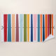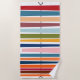 This beach towel has a mid-century modern design of horizontal coloured lines on a vertical black line with circles.