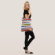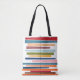 This tote bag has a mid-century modern design of horizontal coloured lines on a vertical black line with circles.m
