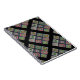 Afghan pattern of nine-patch in crochet. Photo of antique afghan worked in "granny squares", using a multitude of coloured yarns, Nine squares are repeated with a black border between. Patch is set on the diagonal.