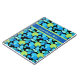 A spiral Notebook or Journal to personalise, with a 'Blue Moons' abstract pattern in bright blues and neon green on a black background; from a handpainted paper collage design by Judy Adamson.