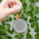 The exquisite design of the white spiral wire pattern against a black background presents a captivating visual appeal, artfully encircled to evoke a sense of binding. Measuring 2.125 inches in diameter and 0.19 inches in depth, with a weight of 0.705 ounces, this premium round keychain exemplifies both elegance and functionality. Its striking aesthetic is sure to enhance any accessory collection.
