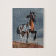 A proud looking paint horse trots over a grassy hill in the American Wild West. This pinto coated mustang wears Native American war paint and has eagle feathers attached to its dark mane. This western warrior stares in your direction with a look of defiance as if to challenge you to mastery over the grassy plains.